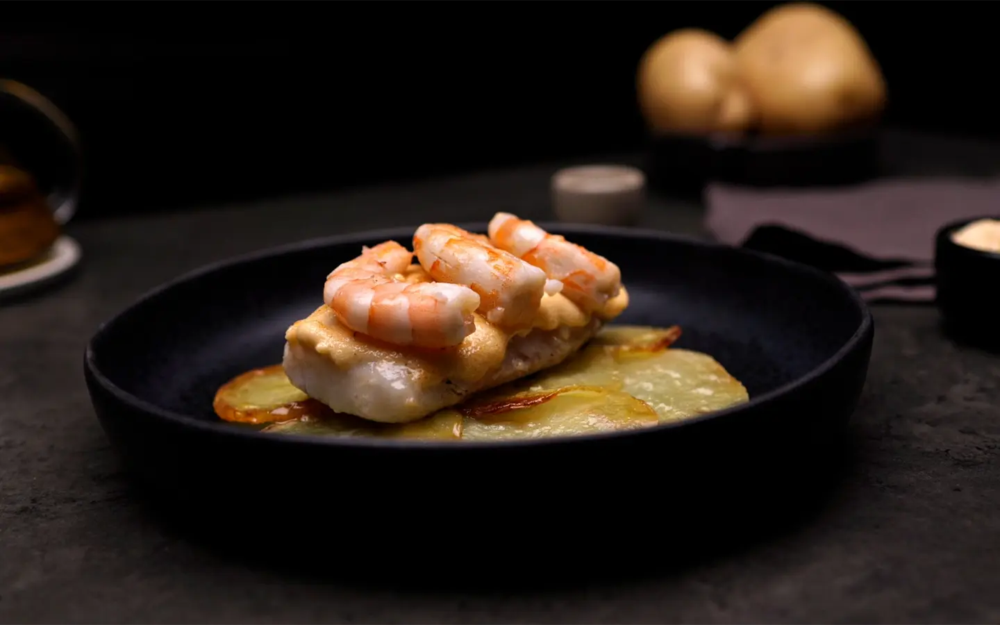 Merluza gratinada con camarones y cama de papas