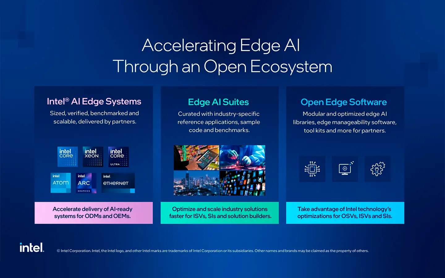 Intel AI Edge Systems, junto con el software Edge AI Suites y su Open Edge Platform, abordan estos desafíos al basarse en la tecnología de Intel, que ya está presente de manera generalizada en el perímetro, y empoderan al ecosistema para entregar Edge AI más rápido.
