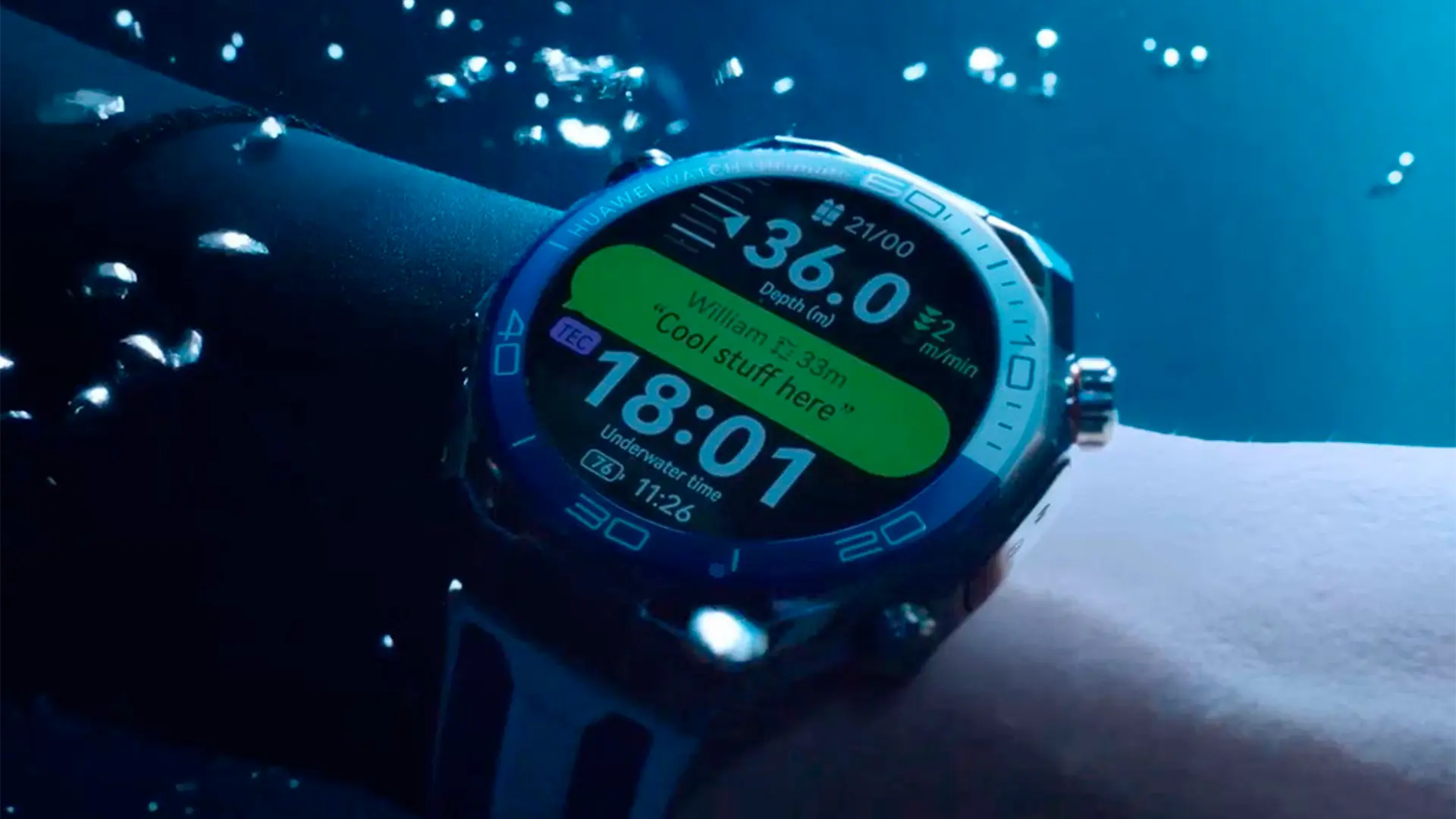 El smartwatch integra un módulo de sonar compacto que hace posible el intercambio de mensajes predeterminados y emojis bajo el agua hasta una distancia de 30 metros. En casos de emergencia, el reloj permite enviar alertas SOS que pueden ser retransmitidas por otros buzos cercanos. Ampliando el alcance hasta 60 metros y aumentando significativamente las posibilidades de recibir ayuda rápida.