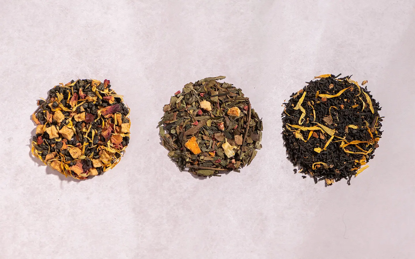 Cozy Fall: Té verde Gunpowder, trozos de manzana, canela, rosa mosqueta, flor de caléndula, pétalos de rosa y sabor natural a creme brulee.