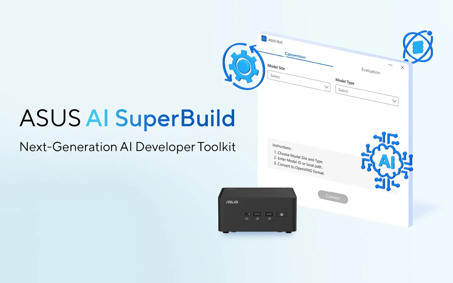 ASUS AI SuperBuild proporciona herramientas a los desarrolladores que les permiten convertir, optimizar y seleccionar fácilmente los modelos correctos para construir las soluciones que necesitan, reduciendo significativamente la complejidad del desarrollo de IA.