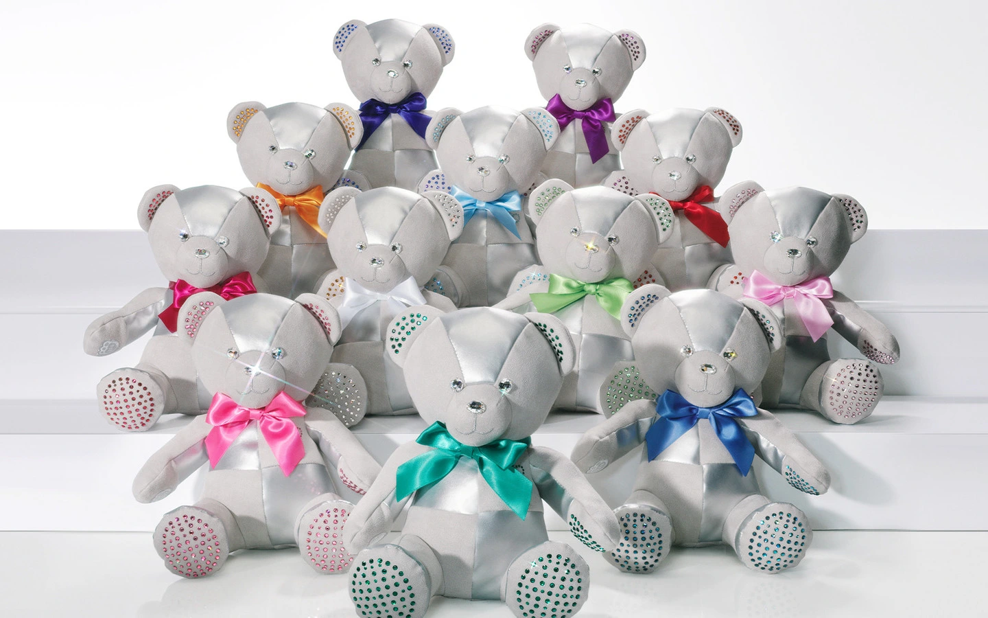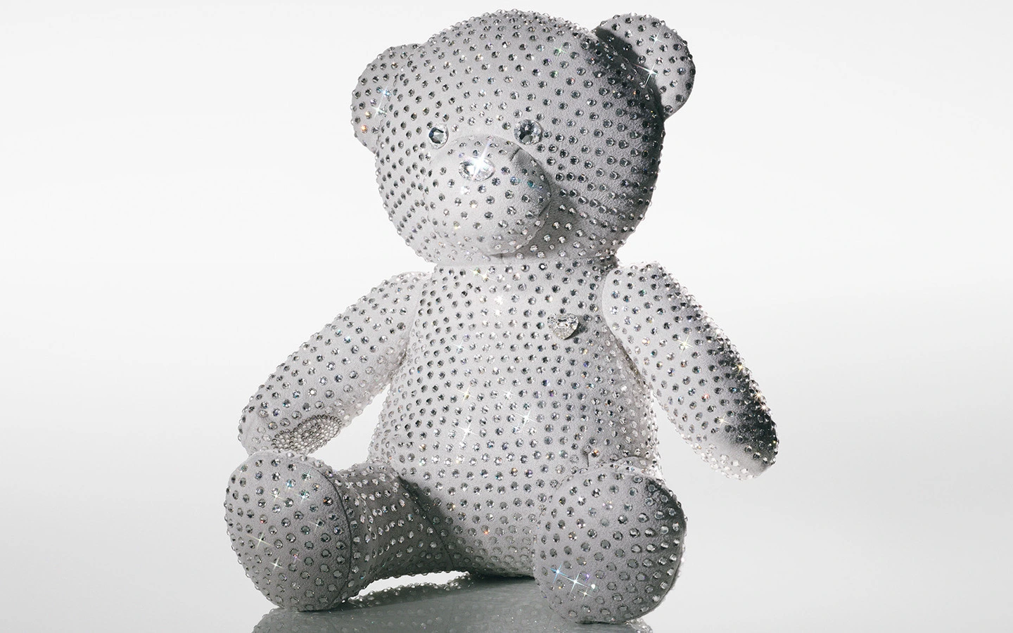 Los rostros, orejas y almohadillas de las patas de los osos están adornados con brillantes cristales, mientras que un lazo de satén y una piedra en forma de corazón aseguran que cada pieza sea tan lujosa como adorable.