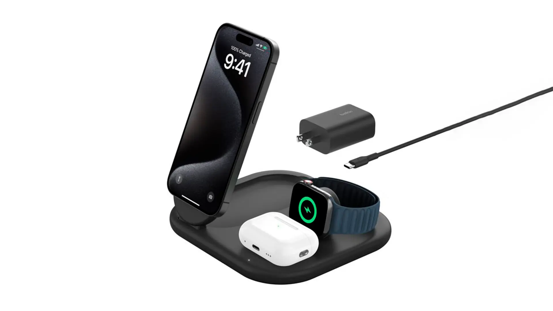 Solución todo-en-uno para cargar iPhone, Apple Watch y AirPods desde una base portátil y elegante.