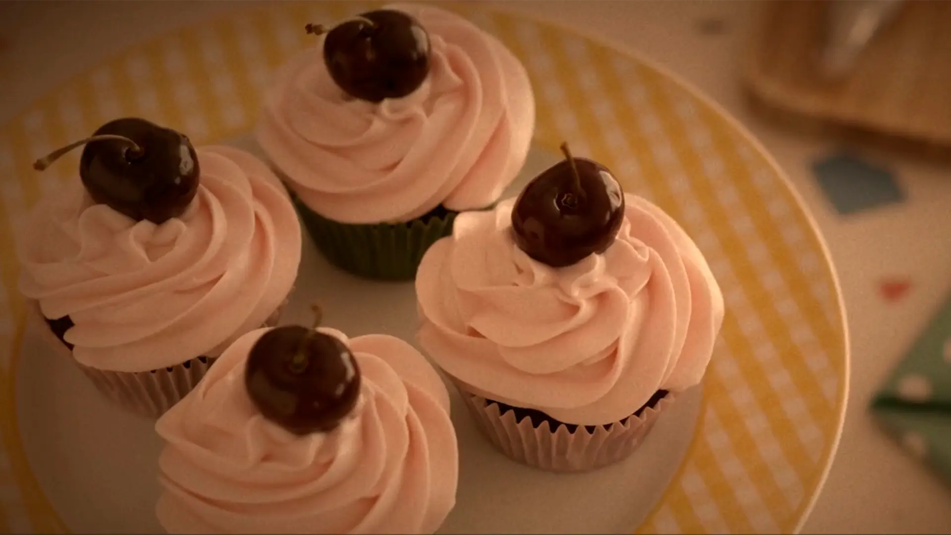 Para el frosting, tamiza el azúcar flor y bátelo con la mantequilla hasta lograr una crema clara y aireada. Agrega el queso crema y el colorante, batiendo hasta obtener una mezcla sedosa. Coloca en una manga pastelera y decora cada cupcake, coronando con una cereza fresca.