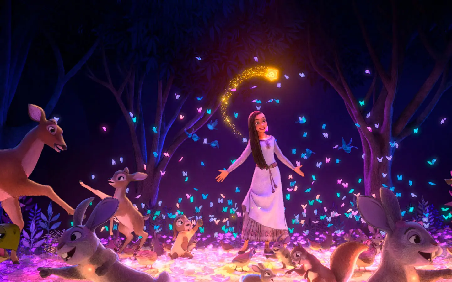 “Una estrella”, es una canción interpretada por 22 solistas que pone a cantar a los animales y las plantas del bosque, y es un guiño a Blanca Nieves y Aurora. Dice Michaels: “Asha comprende que todo está hecho de polvo interestelar. Es un momento tan divertido y bello, y siempre se me escapa una lágrima cuando la miro”.