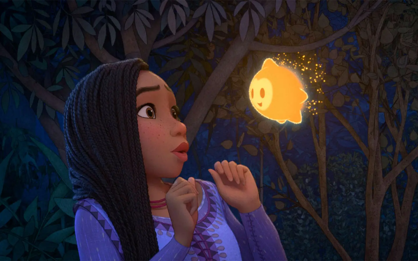 “Una estrella”, es una canción interpretada por 22 solistas que pone a cantar a los animales y las plantas del bosque, y es un guiño a Blanca Nieves y Aurora. Dice Michaels: “Asha comprende que todo está hecho de polvo interestelar. Es un momento tan divertido y bello, y siempre se me escapa una lágrima cuando la miro”.