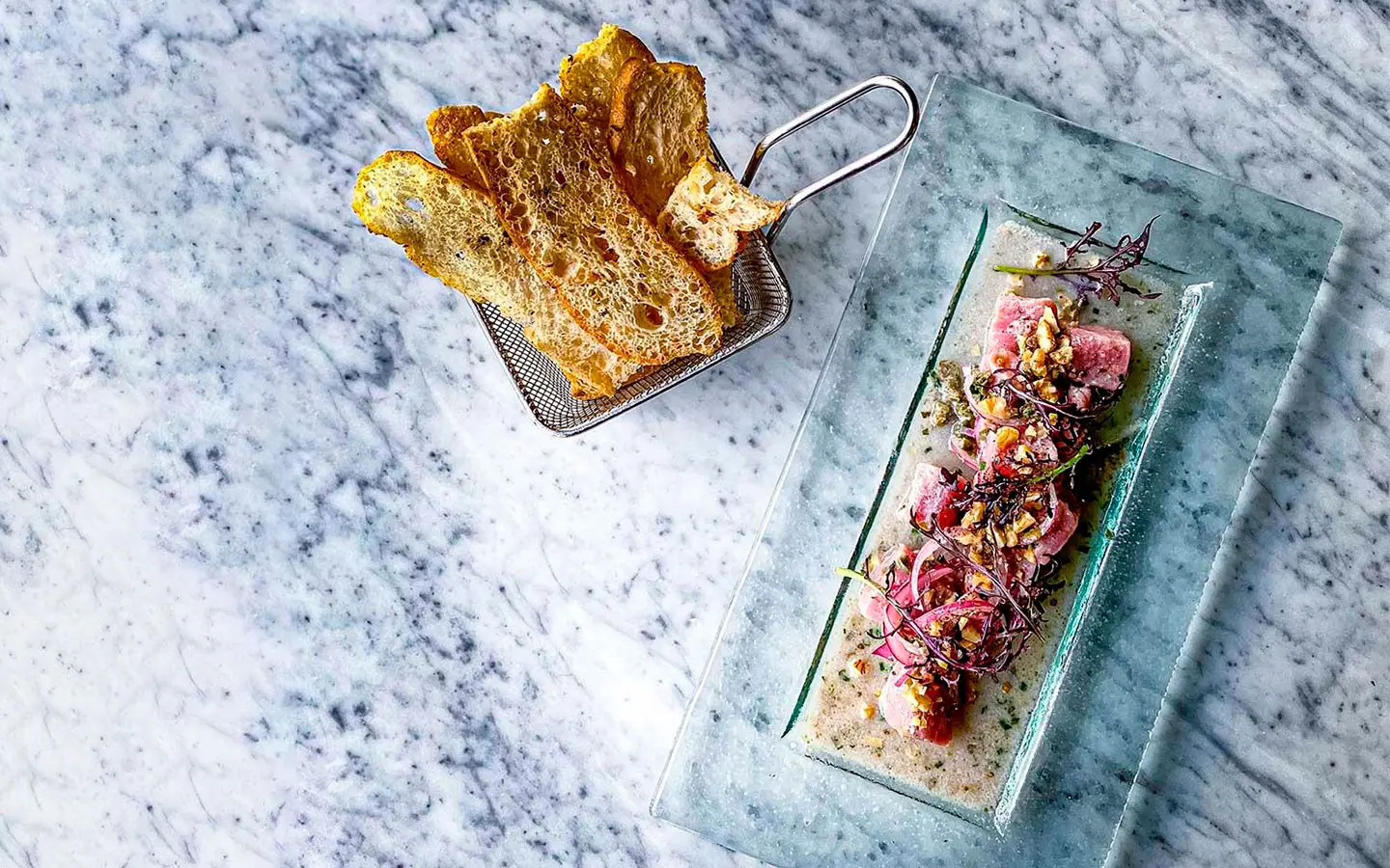 Otro spot que celebra la frescura del mar es el Ceviche del Bar del restaurante Bar de Río. Un plato que encarna la esencia de la cocina costera con un pescado fresco que se sumerge en leche de tigre, despertando todos los sentidos con su equilibrio perfecto de acidez y sabor. El crujiente toque de cancha, que aporta textura y un toque de maíz, completa esta preparación que es reconocida por llevar a los comensales a un viaje de placer culinario en cada bocado. Valor $12.900