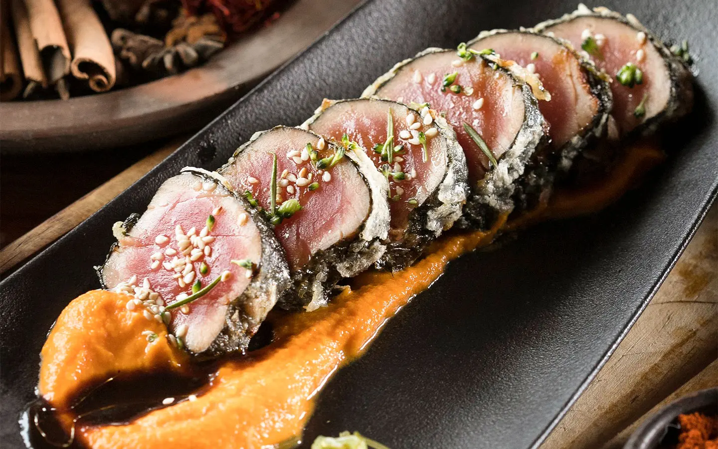 El restaurante Zanzíbar –recientemente premiado como mejor Rooftop de Latinoamérica– destaca su Atún teriyaki. Su chef, Victor Salazar, menciona que “decidimos trabajar con lomo de atún azul en este plato, el cual se macera en una infusión de soya, salsa de ostras, azúcar y aceite de sésamo. Buscamos el tiempo y la temperatura exacta para sellarlo por fuera y mantenerlo jugoso y fresco por dentro. El siguiente se corta en láminas y lo servimos sobre una cama de puré de zanahoria, lo terminamos con nuestra salsa teriyaki de la casa y a disfrutar”.