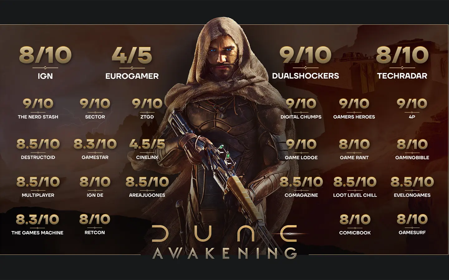 A medida que la respuesta de los jugadores, la prensa y los creadores de contenidos se ha disparado en Internet, se han ido destacando aspectos clave del juego en particular. Con una línea temporal deliberadamente alternativa, la fidelidad al universo de Dune y la inspiración visual y sonora tomada de las taquilleras películas de Denis Villeneuve y Legendary son evidentes. VGMAG, quienes le dieron un 8.5/10 lo calificó como “la mejor forma de experimentar Arrakis«. 4P, quienes lo puntuaron 9/10 dijo: «No conozco ningún mundo de juego que sea más Dune que el de Dune: Awakening”. Para aquellos que han esperado años para explorar una Arrakis abierta y viva, Dune: Awakening ha cumplido.