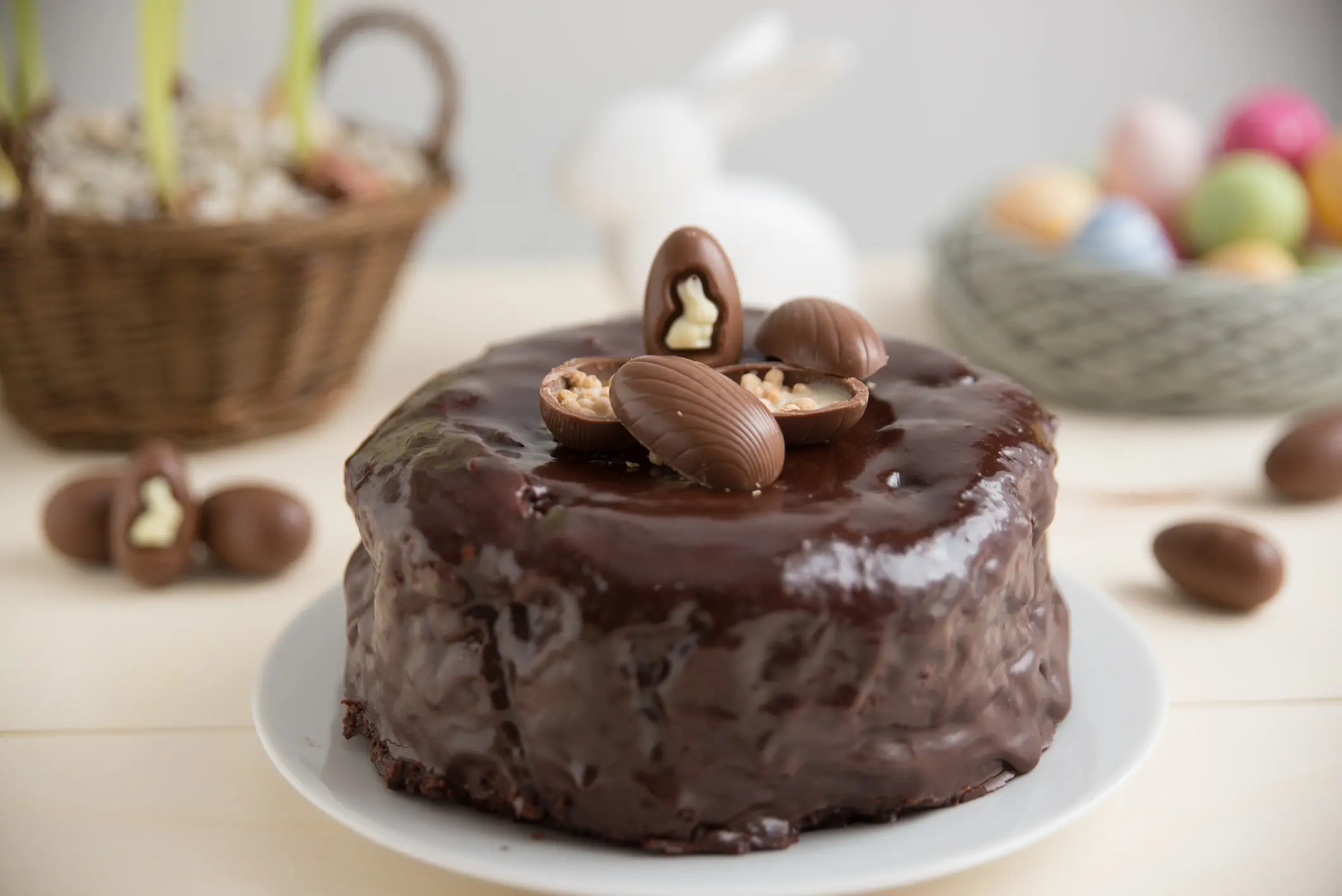 que se derrita. Baña el queque con la ganache y decora con huevitos de chocolate o confites.