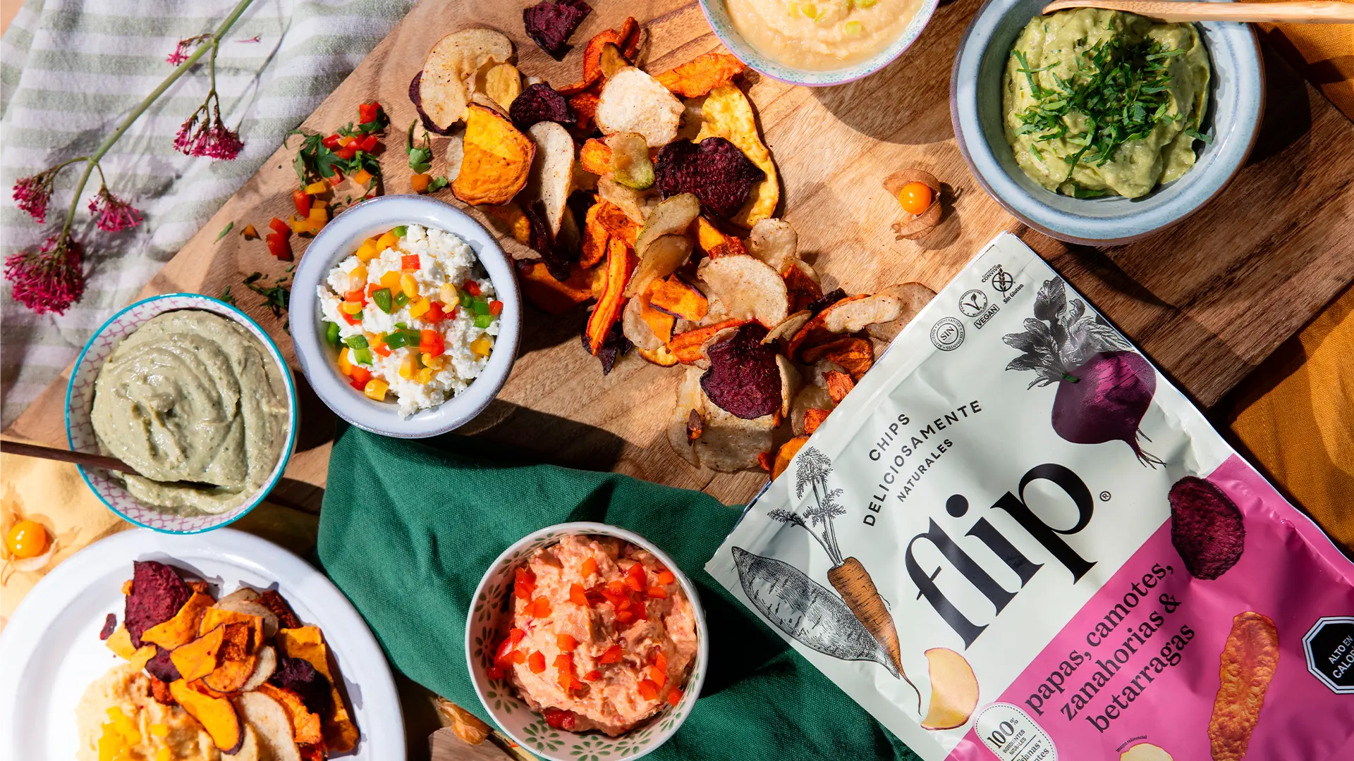 Los snacks de Flip son elaborados en base a verduras y dado su proceso tecnológico, conservan mejor los nutrientes, tienen hasta tres veces menos grasa, mantienen el color original y mantienen el sabor propio de la papa y los vegetales.