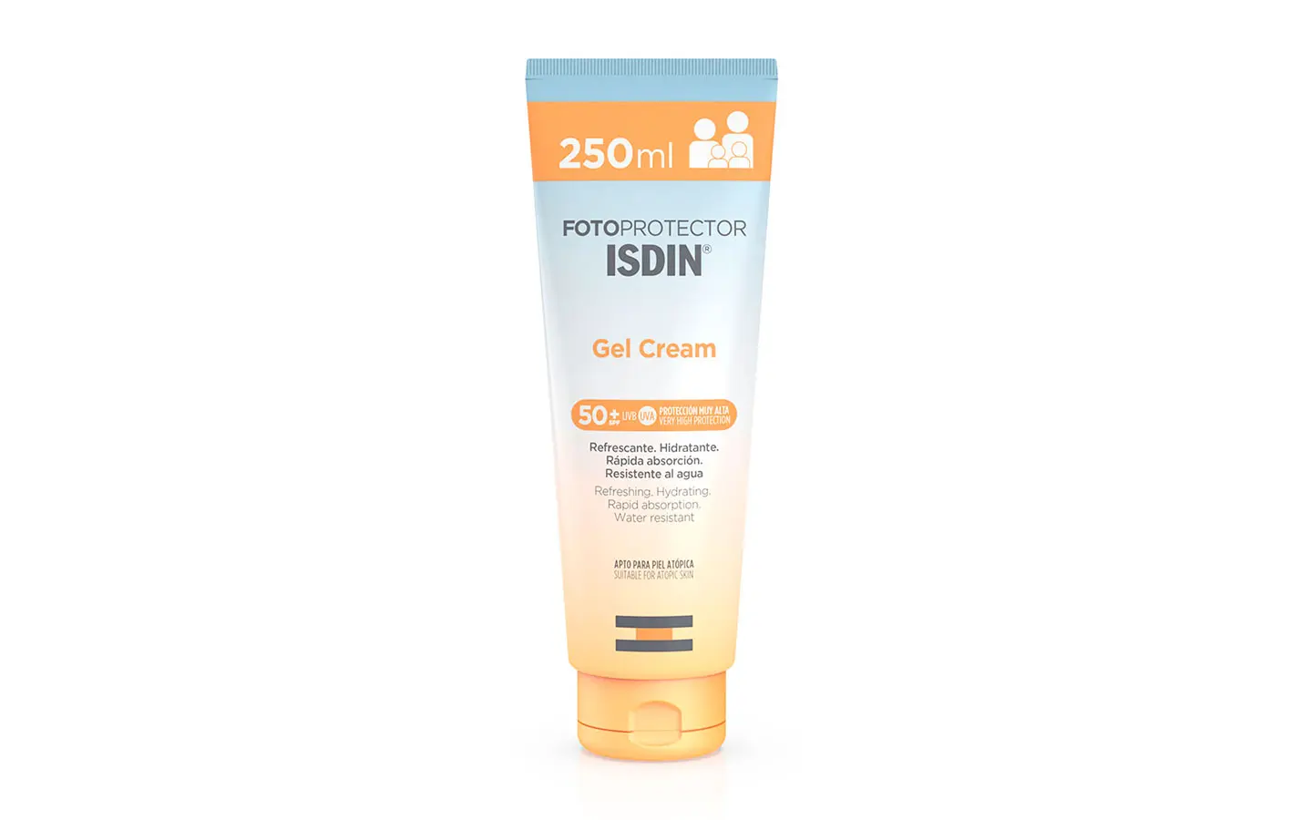 Posee tecnología Wet Skin, que permite su aplicación tanto en piel mojada como en piel seca sin dejar residuo blanco y manteniendo el factor de protección. Es resistente al agua, permite su aplicación en cualquier dirección y es apto para todo tipo de pieles, incluida piel sensible y/o atópica.