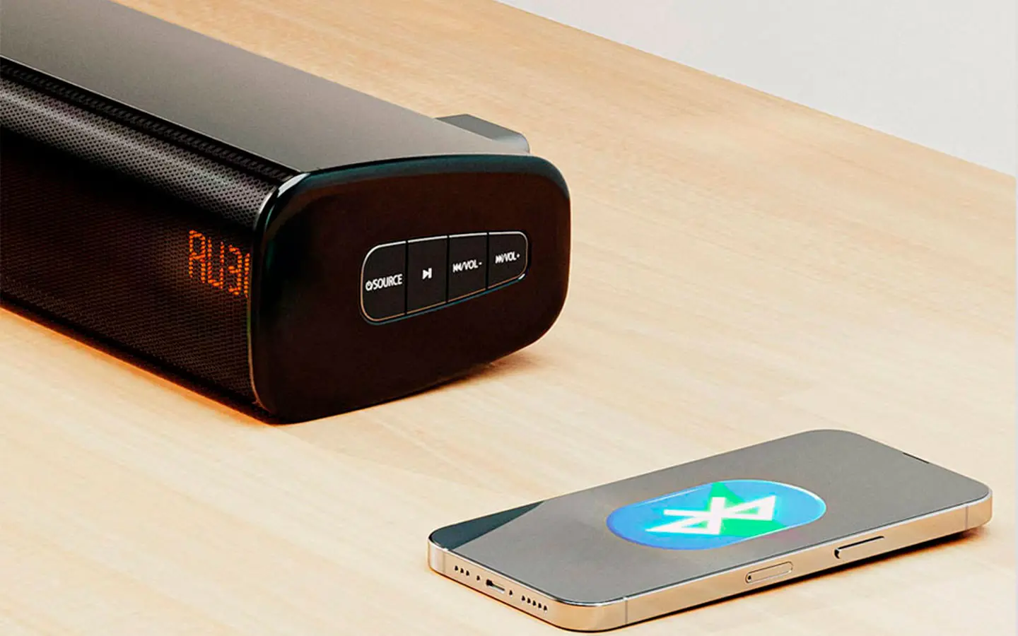 - Botones en la barra de sonido: Encendido/fuente, Reproducir/pausa, Pista previa/volumen -, Pista siguiente/volumen +