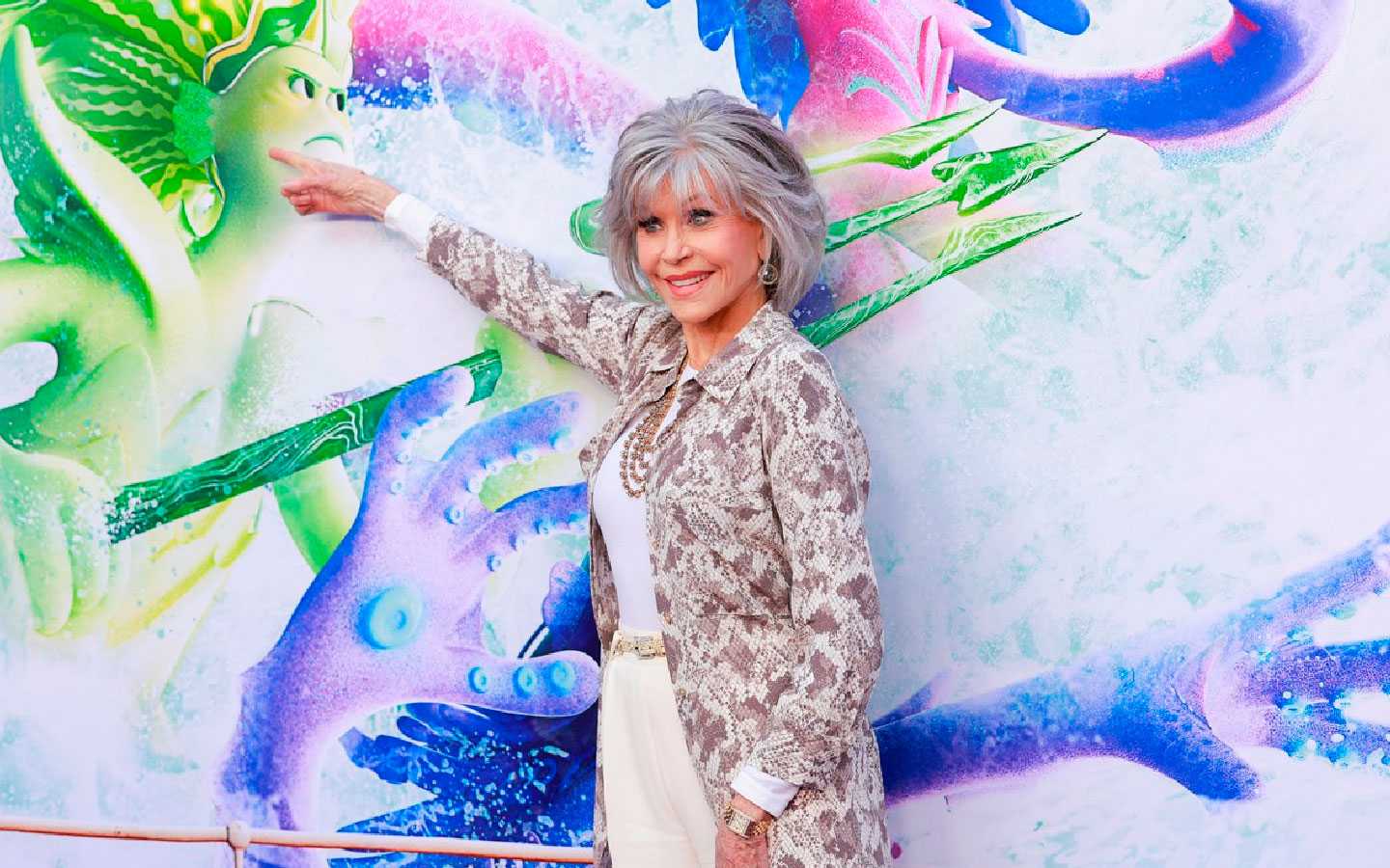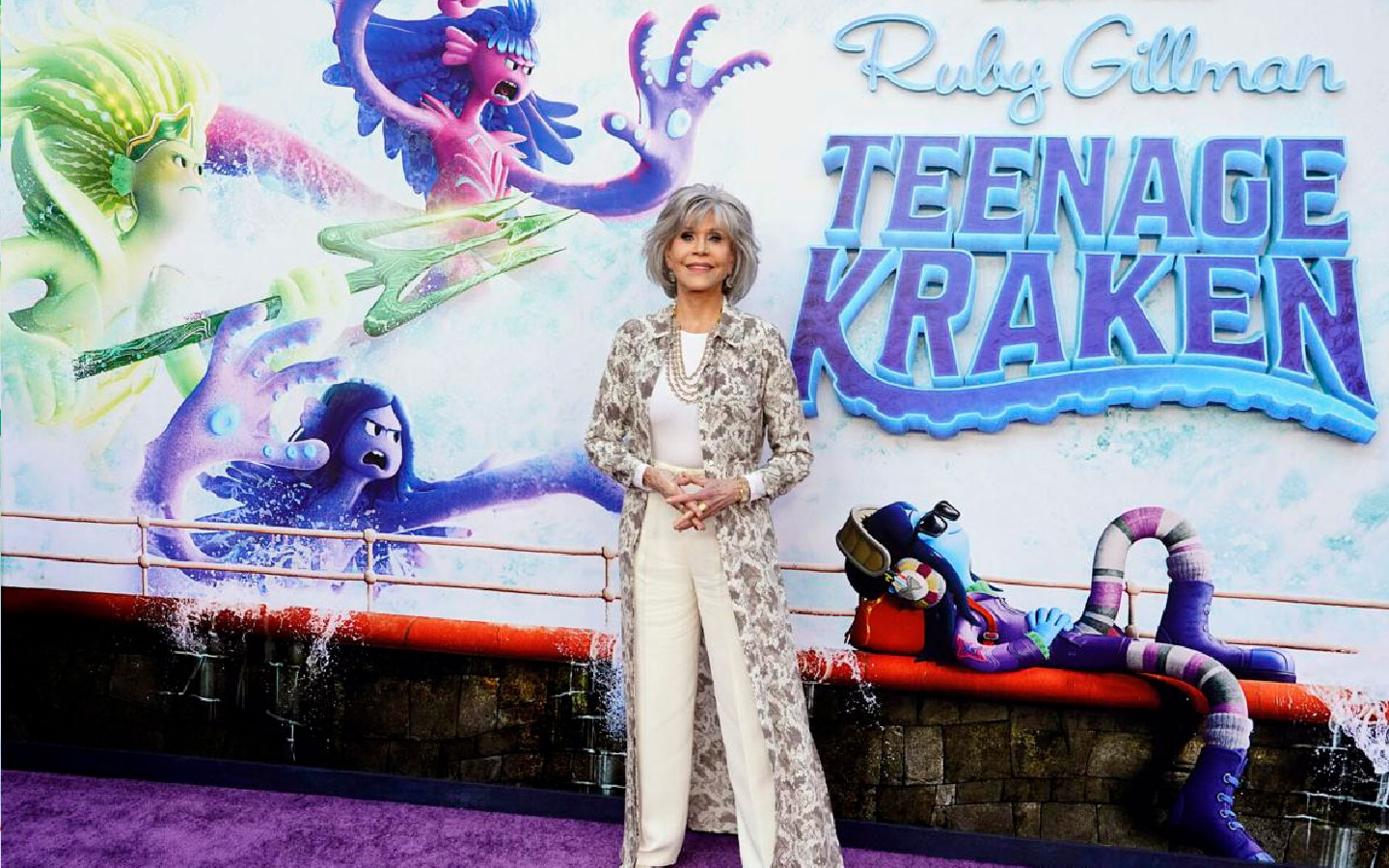 Pero cuando rompe la regla #1 de su madre, Ruby descubrirá que es descendiente directa de las reinas guerreras Kraken. Y está destinada a heredar el trono de su abuela, voz de la ganadora al Premio de la Academia, Jane Fonda. Quien no necesita presentación y acá da vida a la Reina Guerrera de los Siete Mares.
