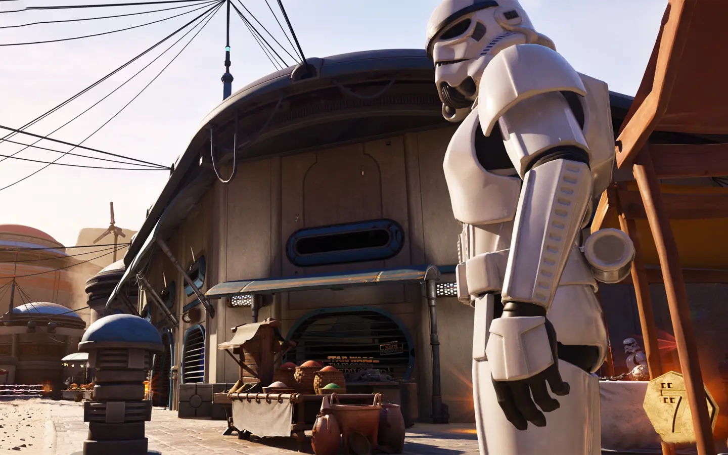 La isla Fiesta de Star Wars también estará disponible a partir del 2 de mayo, y desde las 8 AM MX / 11 AM AR los jugadores podrán ver los primeros dos episodios de la nueva serie de antología animada de Lucasfilm, Star Wars: Historias del Inframundo. Además del cine al aire libre, la isla ofrece una arena de batalla donde los jugadores pueden enfrentarse a oleadas de Stormtroopers utilizando blasters y sables de luz. Esta isla fue creada con Unreal Editor para Fortnite (UEFN) y utiliza elementos oficiales de Star Wars para ofrecer un entorno impresionante inspirado en una galaxia muy, muy lejana.