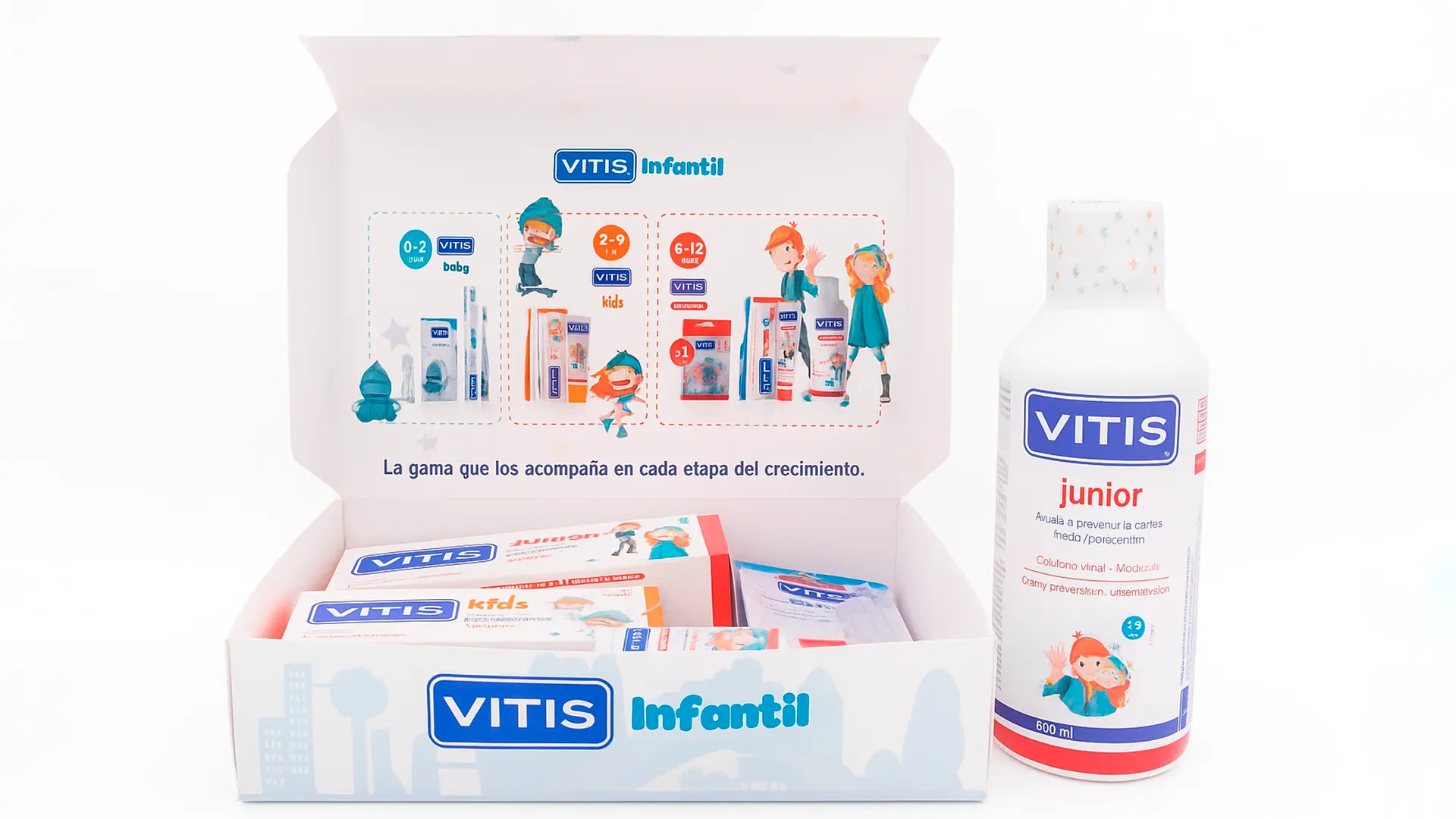 - Enjuague bucal Vitis Junior: complemento perfecto que fortalece los dientes y protege contra la placa bacteriana.