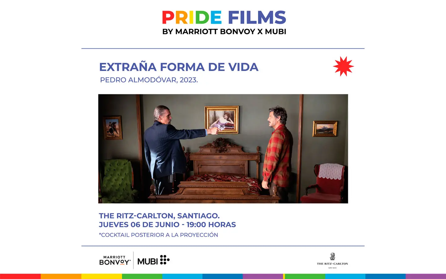 El ciclo comenzará el 6 de junio en el hotel The Ritz-Carlton, Santiago con la proyección de «Extraña Forma de Vida». Un cortometraje western romántico dirigido por Pedro Almodóvar y protagonizado por Pedro Pascal y Ethan Hawke. Esta será la primera de varias proyecciones en diferentes hoteles de la cadena Marriott en la capital.