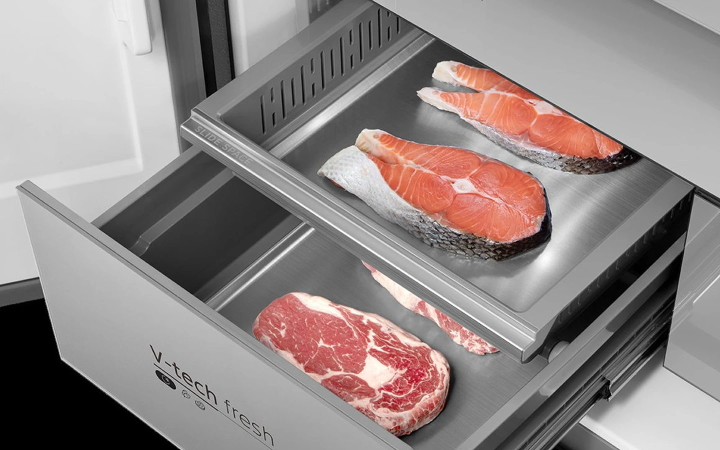 La tecnología V-TECH FRESH permite la medición precisa de la temperatura de los alimentos en milisegundos, para luego ajustar inteligente la temperatura óptima para las carnes y pescados.  De esta manera, estos alimentos pueden durar hasta 7 días, conservando sus nutrientes y propiedades alimenticias.