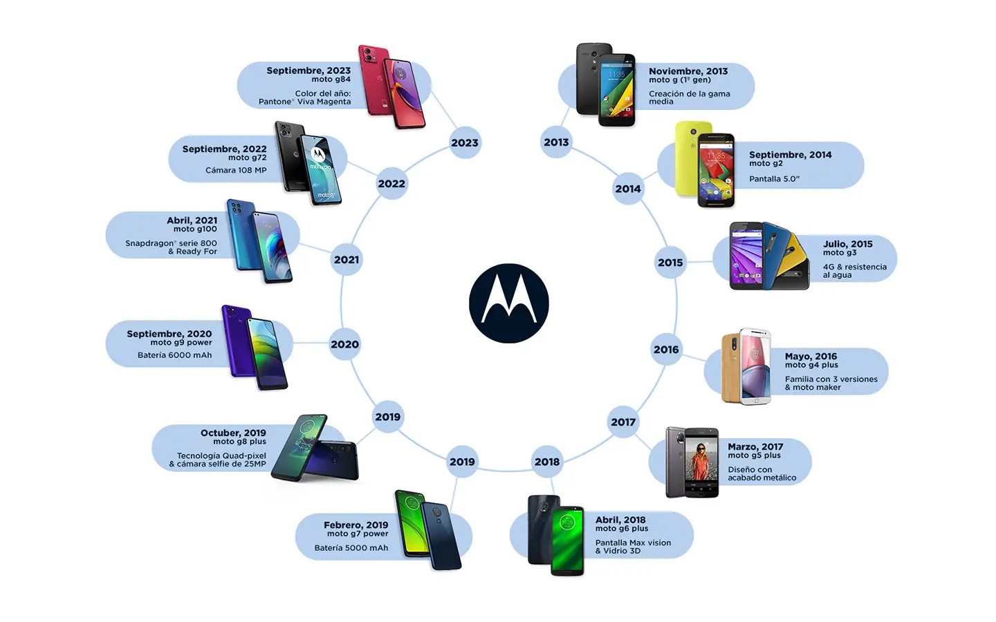 Cuando Motorola se embarcó en este viaje hace una década, sabía que la mejor manera de predecir el futuro era ocuparse de inventarlo. Por eso, comparte cómo este viaje de una década ha redefinido el concepto mismo de los smartphones de gama media. Los dispositivos móviles seguirán siendo cada vez más esenciales para los consumidores como plataformas informáticas personales y objetos de autoexpresión. Por lo que la marca continuará siendo implacable en la creación de los productos y experiencias más avanzados, competitivos y deseables para sus consumidores de la familia moto g.