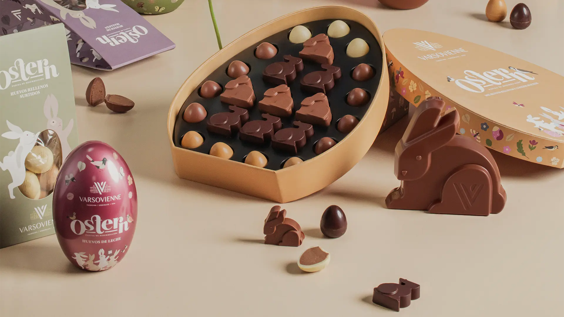 Este año, Ostern presenta una colección de 20 productos, ampliando su propuesta con nuevos formatos. Entre ellos destacan los tradicionales huevos metálicos de 78 gr a $8.290 y 160 gr a $14.990; la cartera de huevitos de 135 gr y 148 gr a $11.990; el saco de conejos de 215 gr a $16.990 y la clásica caja huevo de 139 gr a $13.990. Como novedad, se incorpora la caja de huevos rellenos y conejos macizos de 232 gr a tan solo $19.990. La propuesta incluye tanto opciones tradicionales como versiones sin azúcar, ofreciendo una variedad de sabores y formatos, todos bajo una gráfica que representa el espíritu de Varsovienne y da unidad a toda la campaña.