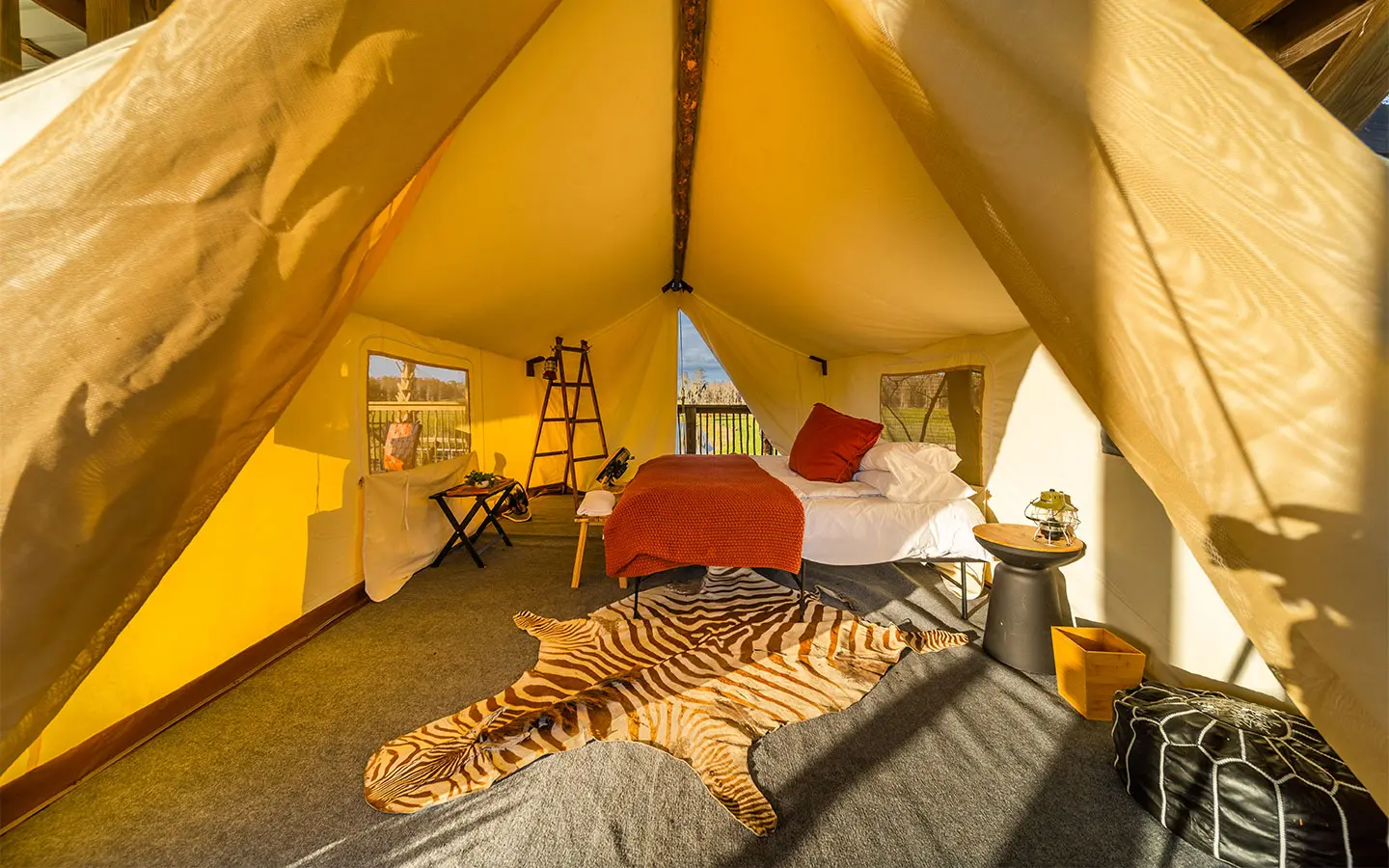 Los huéspedes que busquen más comodidades pueden optar por la experiencia de camping Premium. El Overlook está situado en el centro y tiene una vista sin obstáculos de 360 grados de toda la propiedad. El mirador tiene un cuarto de baño privado con aire acondicionado y ducha, así como la mejor ubicación para avistar animales de la propiedad. Otras comodidades son una mininevera y un mostrador con aperitivos y una cafetera Keurig. Y por un precio extra se puede dar un paseo en camello hasta el lugar. No es mala idea para una luna de miel.