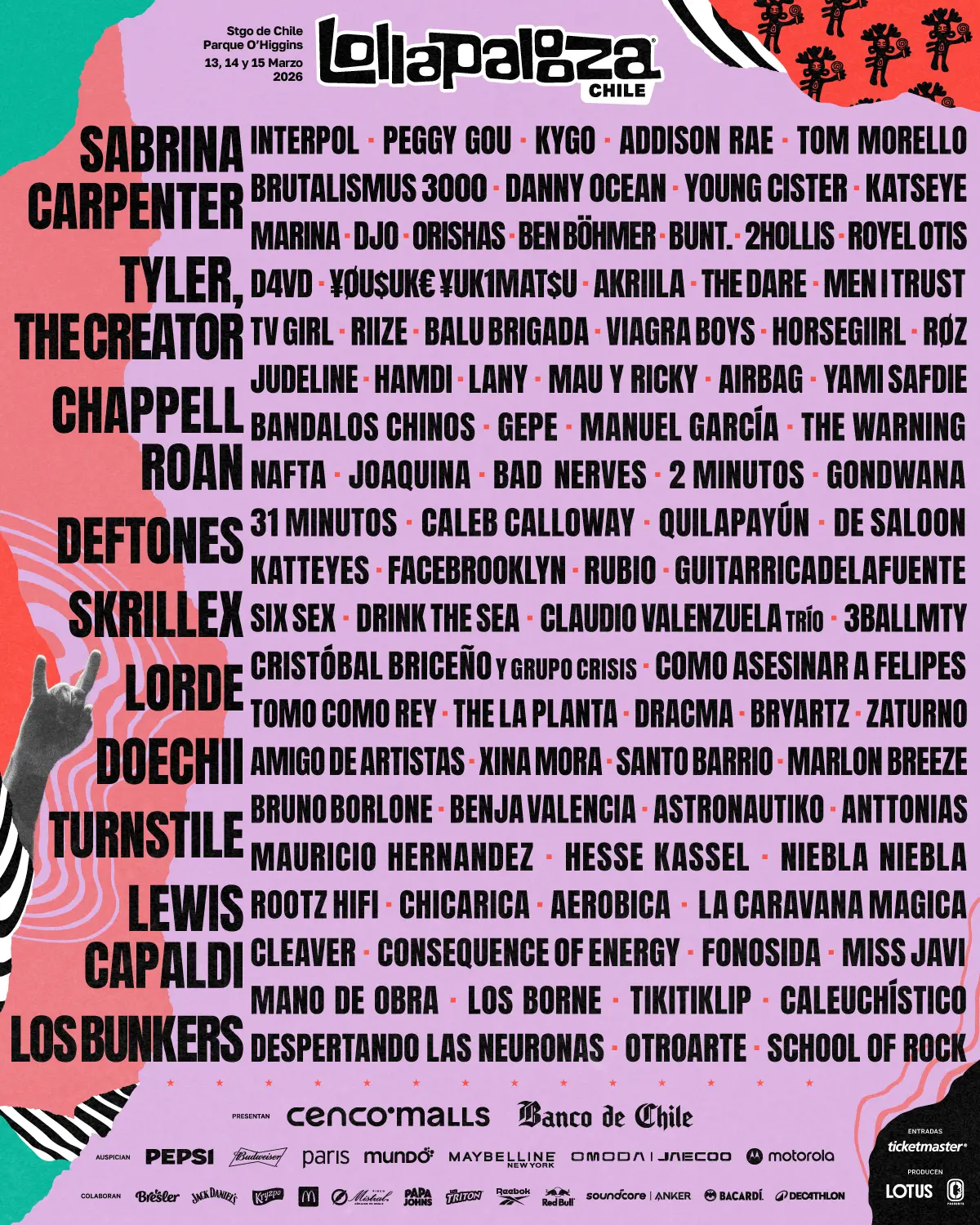Esperados debuts e icónicos regresos marcarán la nueva edición de Lollapalooza Chile que se vivirá el próximo 13, 14 y 15 de marzo. Sabrina Carpenter, Tyler, The Creator, Chapell Roan, Doechii y Lewis Capaldi, por primera vez en Chile. Junto a los regresos de Deftones, Skrillex y Los Bunkers, son los encargados de encabezar la edición 2026. También se suman nombres claves en la escena mundial. El rock alternativo de Interpol, Tom Morello, la fuerza de la electrónica de Kygo, Peggy Gou y Brutalismus 3000. Y por último, el pop de Katseye, Addison Rae, Marina, y los sonidos urbanos de Danny Ocean y Young Cister, entre muchos más.