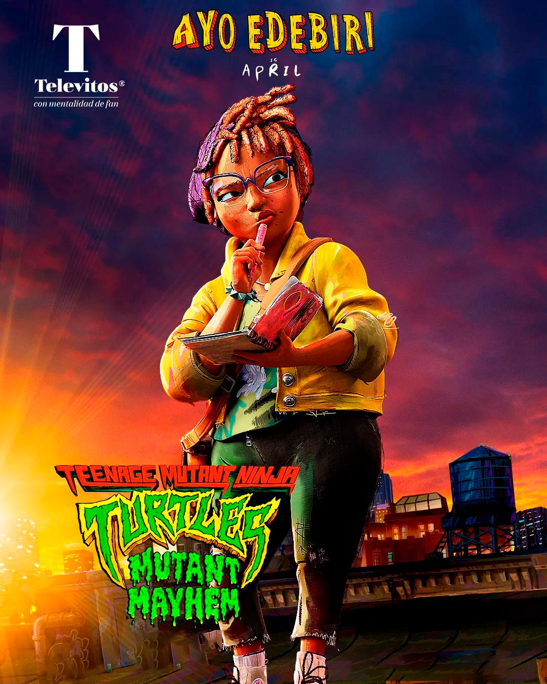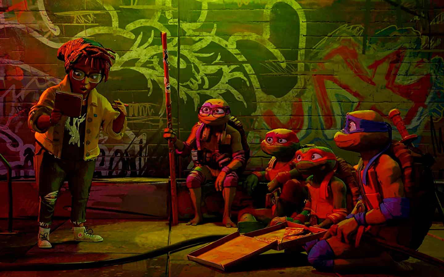 Por otro lado, los hermanos añoran vivir entre los humanos, ser respetados, amados por ellos y tener las mismas experiencias que cualquier adolescente mundano vive. Tras un pequeño incidente, conocen a April O’Neil (Ayo Edebiri). Y será ella quien los ayuda a mostrarse como héroes en la ciudad y así llegar a sus sueños de convivir con todos. Por esto, crean un plan para derrotar al villano más temido en la ciudad “Superfly” (Ice Cub). Llevándolos a un viaje de hermandad y confianza con la familia.