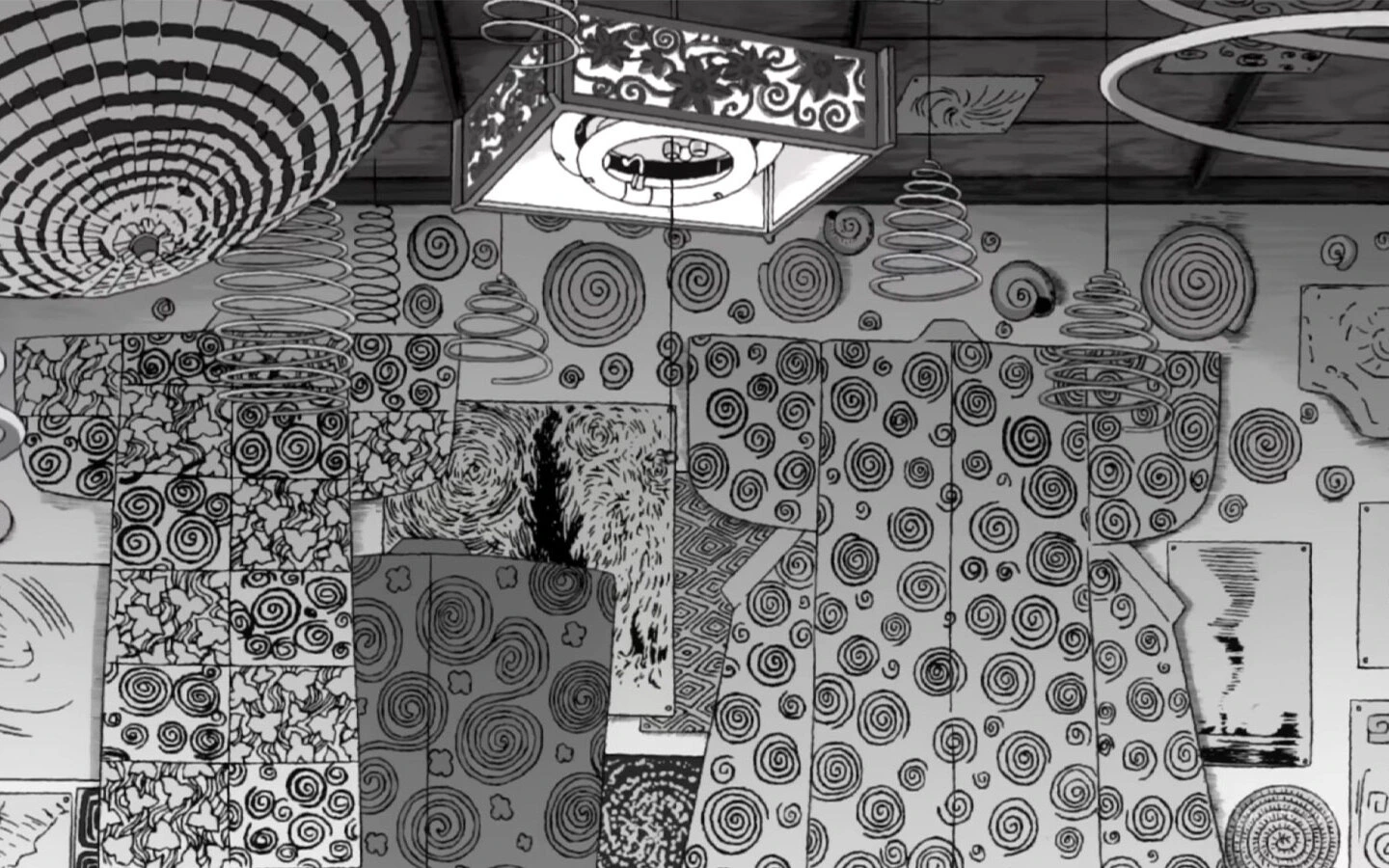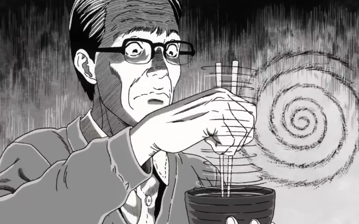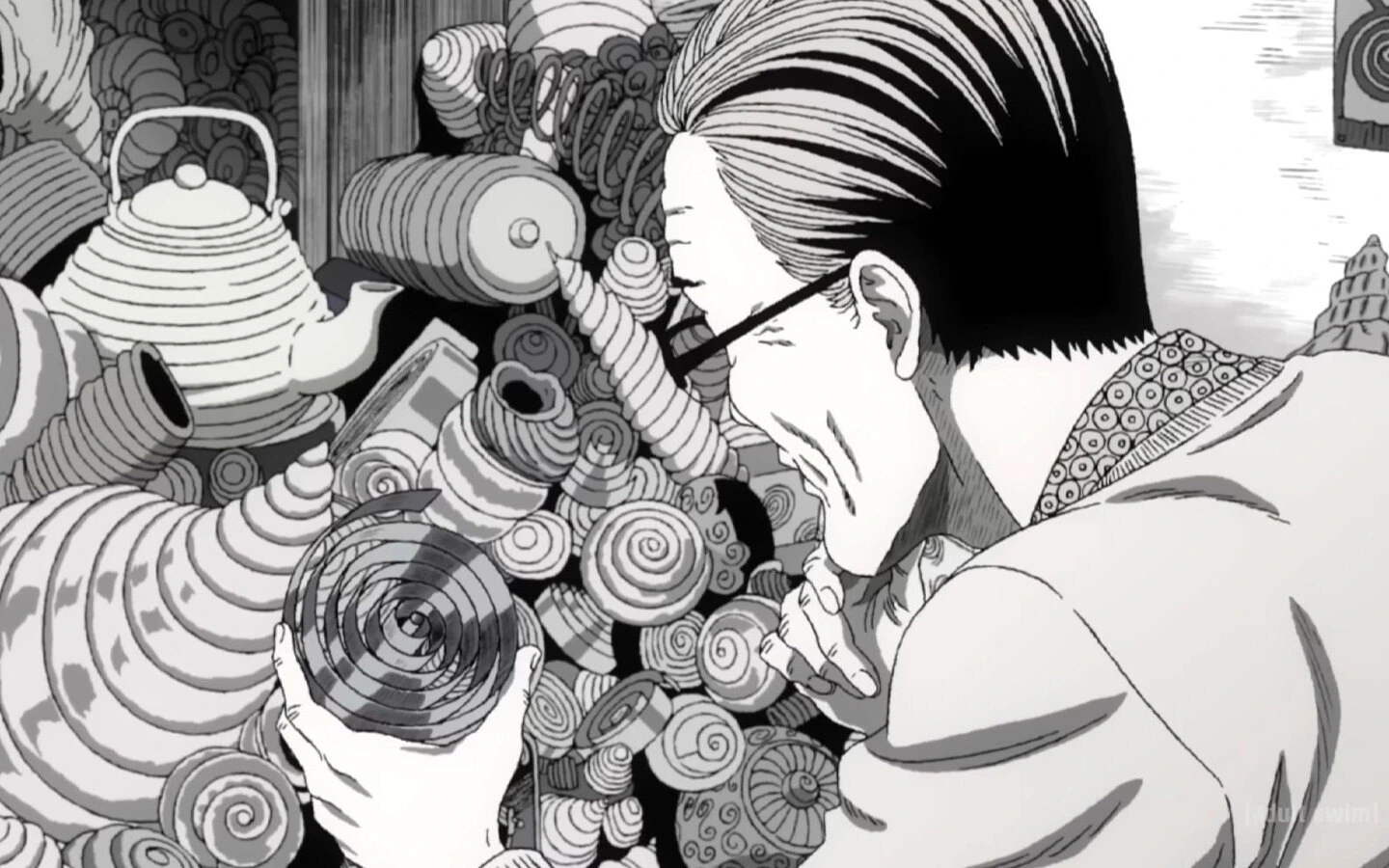 Así, rápidamente la serie introduce a esta figura: un hombre maduro que pasa sus días mirando espirales, en un especie de trance que lo lleva a girar sus globos oculares. Para más tarde llegar a un punto máximo de compulsión y una decisión que se vuelve mortal.