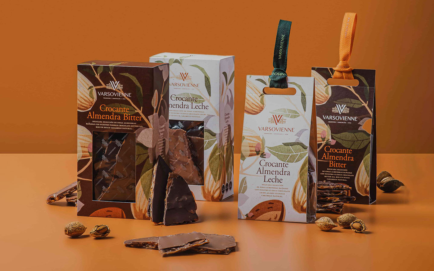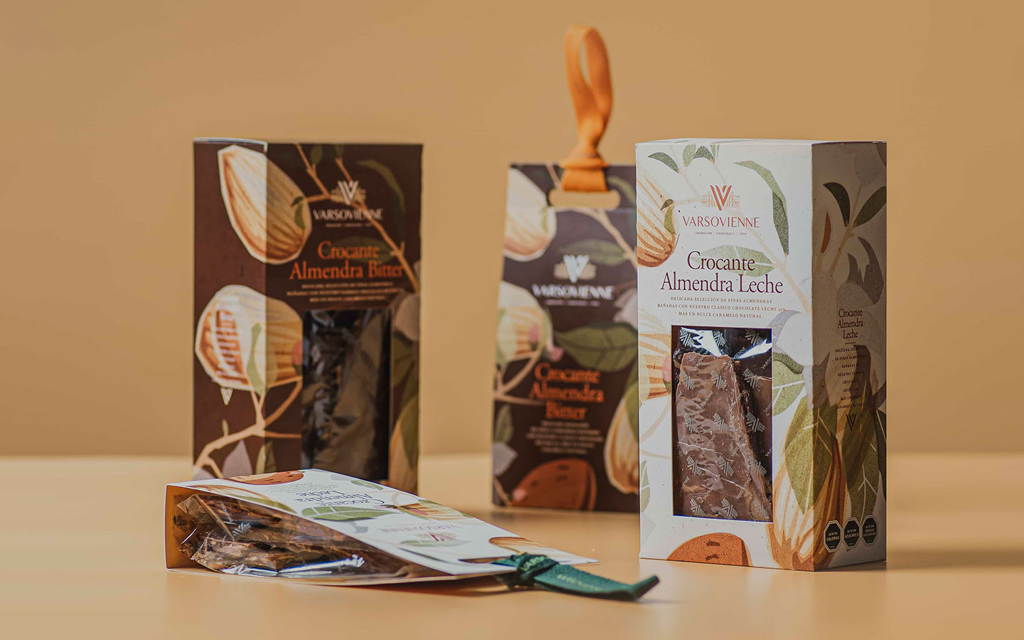 La nueva edición Crocante Almendra nace de la mezcla de finas almendras laminadas de la mejor selección, un dulce caramelo natural hecho en la tradicional fábrica y una calidad característica del chocolate Varsovienne en su versión Bitter 63% cacao y Leche 36% cacao.
